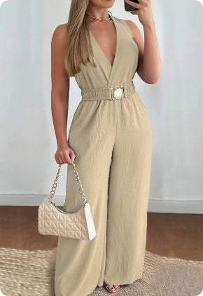 Cette combinaison redéfinit l'élégance moderne avec une coupe parfaitement équilibrée. Le décolleté en V plongeant apporte une touche de sensualité raffinée, tandis que la taille marquée par une ceinture élastique à boucle dorée sculpte la silhouette pour un effet sablier instantané. C'est la pièce idéale pour celles qui recherchent une allure à la fois autoritaire et gracieuse.